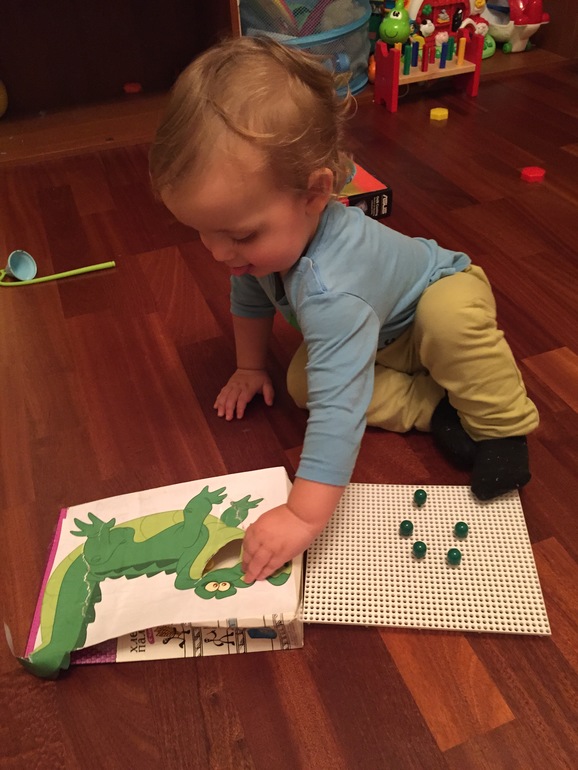 А потом оказалось, что у нас там еще живет крокодил, зеленый соответственно, и ест только зеленые фишки от мозаики. Мы его решили немного угостить.