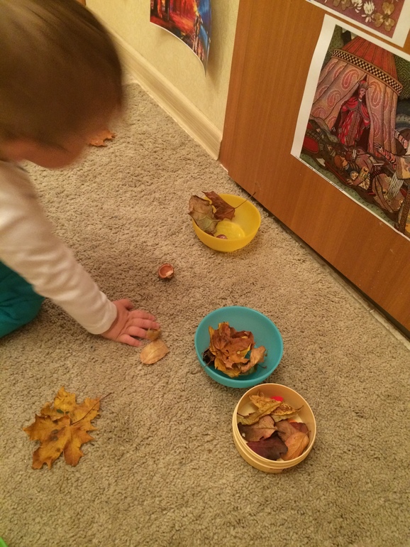 Прятать на этот раз я решила в большие мисочки под листиками, этот вариант прошел лучше, но Матвей все равно искал только желуди.