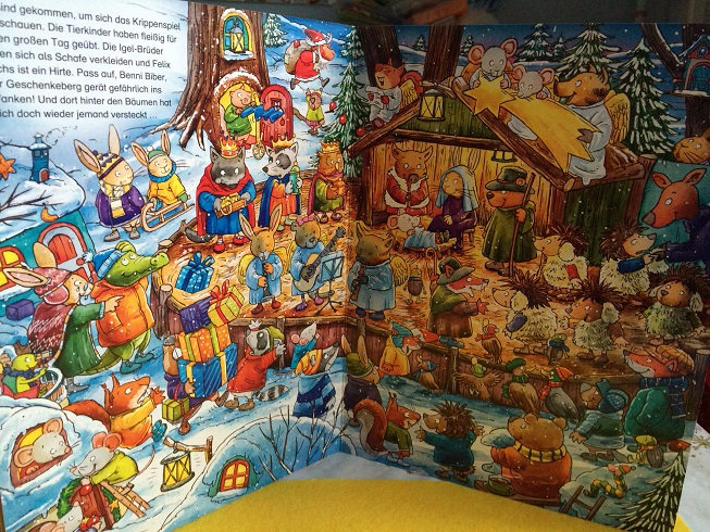 9) Joachim Krause. Weihnachten im Wiimmelwald. Формат А4. 7 разворотов + обложки в картинках. Данная книга точно для малышей до 3 лет. Детские взгляды у героев, не до конца прорисованные лица и их слишком много. Вот честно, слишком много персонажей. В целом книжка классная, в теплом рождественском стиле!