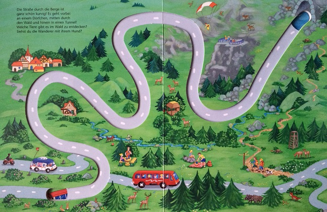 7) Eva Spanjardt. Mein gtoses Spurbuch. Wohin fahrt das kleine Auto?Маленькая машинка в виде монетки перемещается по всем страницам! Восторг!!! Формат А4. В книге 4 разворота, нереальной толщины, я такого еще никогда не видела и первая обложка тоже игровая с картинками и движущейся машинкой. Есть небольшие вкрапления текста на немецком языке. Думаю, это будет стимул вспомнить немецкий. Итак, машинка едет сначала по городу, начиная с обложки, перекатывается на следующий разворот сквозь специальное отверстие, оказывается в пригороде, где ферма и железнодорожный переезд, далее лес и гористая местность, а на последнем развороте машинка оказывается на побережье и едет к парому, где становится в очередь из машин, чтобы отправится в путешествие. Замечательная книга!
