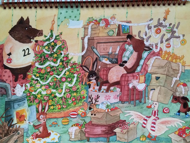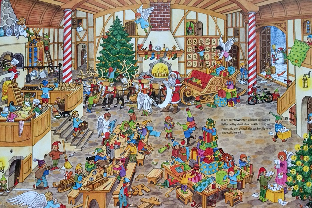 8) Fabian & Christina Jeremies. Mein Adventkalender-Wimmwlbuch. Это настоящий настольный календарь в рождественском стиле с адвент тематикой. Формат А4 на спиралях. Чудесное оформление и шикарная бумага! На каждой странице звери, один из которых помечен датой. Зачем слова- смотрите сами.)) 24 страницы в стиле Виммельбух. Найдите помеченного цифрой зверька на каждом обороте.:-)