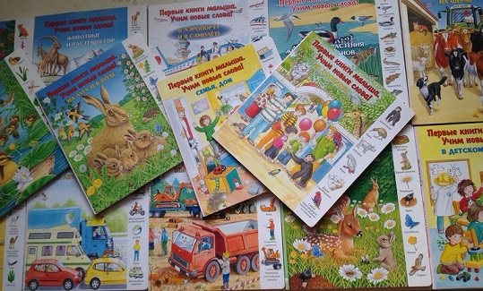 2) Серия «Первые книги малыша. Учим новые слова!» от изд. Улыбка. Чудесные книжки-гляделки в картонных, антивандальных страницах. Книжечки разделены по темам: Семья, дом. В зоопарке. В детском саду. В аэропорту и др. Очень приятная цена книг, что немаловажно, потому что обычно Виммельбухи стоят около 1000р. а если заказывать из Германии, то обходится еще дороже.((((