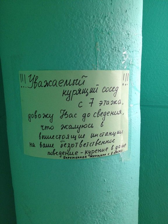 Девочки , это такой кошмар...Он постоянно выходит на лестничную площадку и курит, я с раннего утра и до позднего вечера сталкиваюсь с ним, когда выхожу. Много раз уже подходила и по человечески с ним говорила, указывая на мой достопочтенный пуз и т.д. Крайне вежливо его просила не курить возле моей квартиры, аргументируя это попаданием дыма в те комнаты, которые находятся как раз с той стороны, куда он выдувает типо в окно дым, а этот самый дым залетает на кухню, в кабинет и спальню. Хорошо, что хотя бы в гостиную ничего не попадает, потому что она с другой стороны.