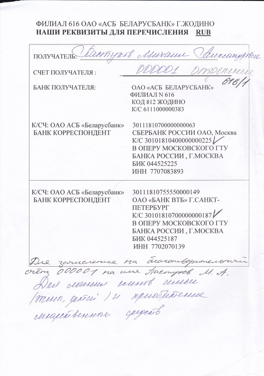 У нас открыт благотворительный счет в Беларусбанке, на который можно перевести деньги: