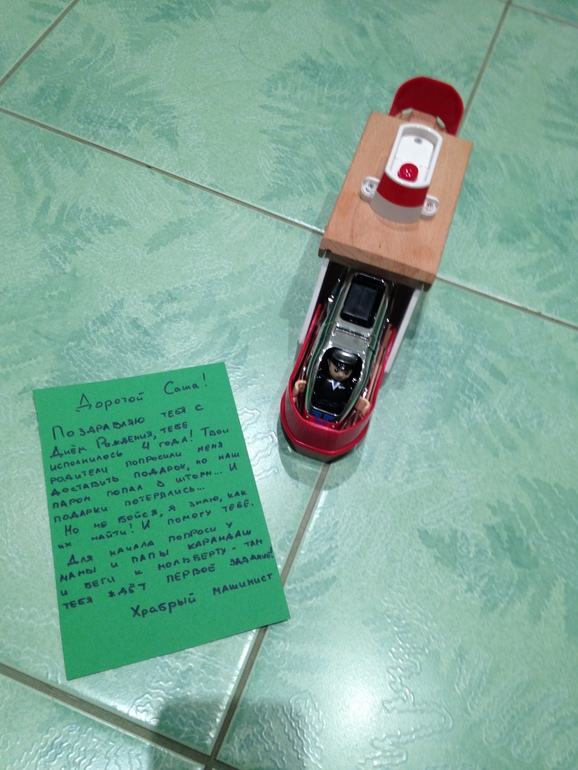Итак, начинался квест в ванной. Пока дети если кашу, из шкафа на самое видное место переместился наш игрушечный паром брио, в котором был первый подарок - брио-вагон и машинист, а еще записка. Выглядело это так. По сценарию, я должна была нажать на кнопку парома и дети с папой прибежали бы на гудок. Но паром меня подвел - звук вдруг пропал, так что пришлось просто самой громко удивиться :)