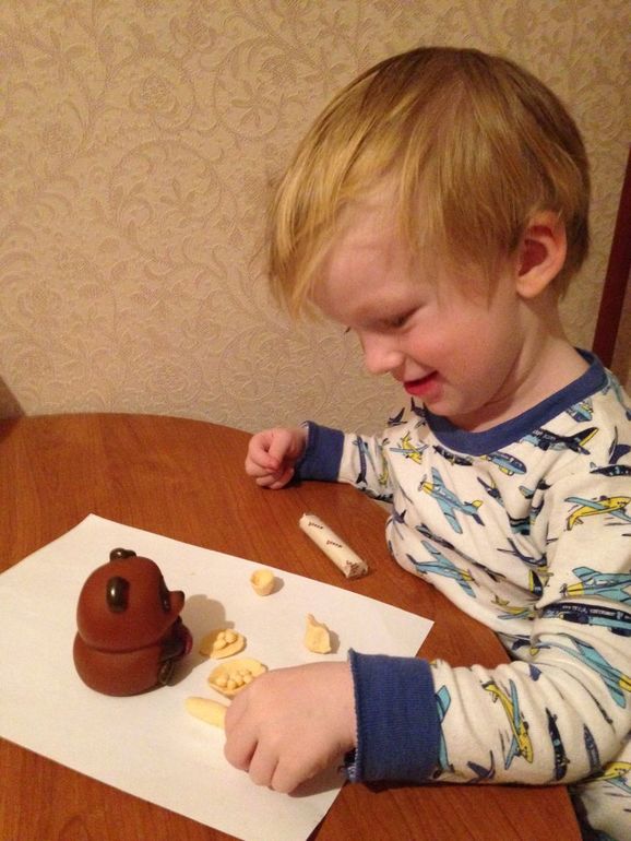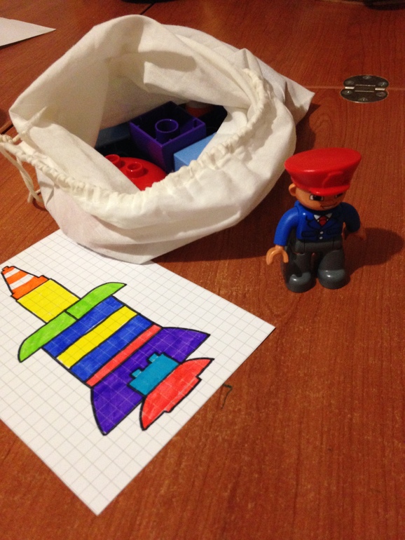 Нас ждал отважный пилот, который видел, как летающая тарелка утащила подарок на верхнюю полку. Для того, чтобы добраться до подарка, надо было построить вот такую ракету из Лего (идея ракеты не моя, подсмотрела на просторах интернета). Я опасалась, что с этим заданием будут трудности - но Саша с блеском справился, что еще раз подтвердило, что уже можно переходить на "взрослое" Лего. И вот подарок найден, ура! (Качество фото ужасное, знаю - лучше ну никак не получалось)