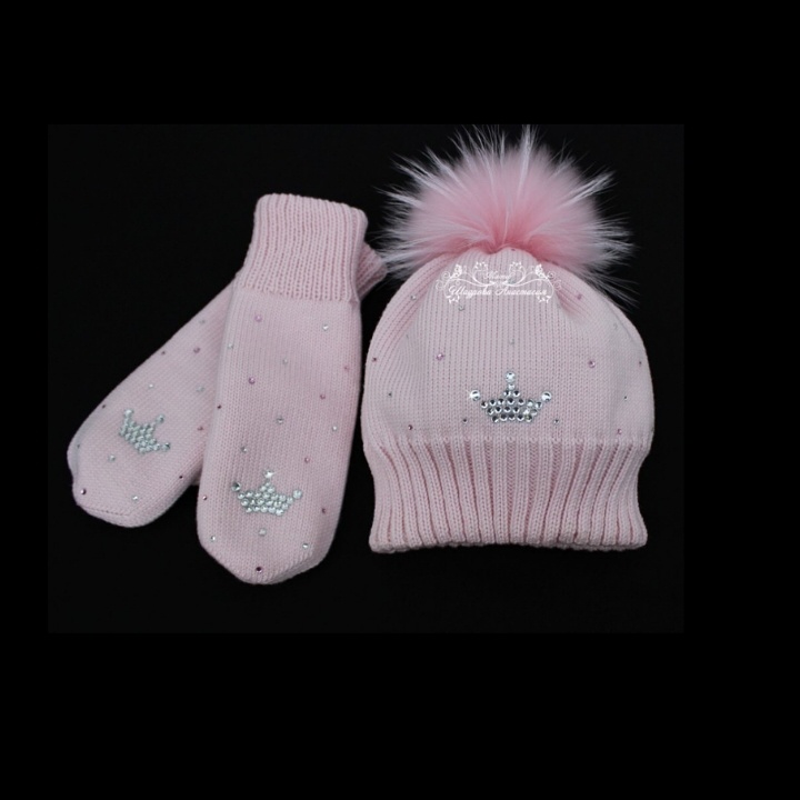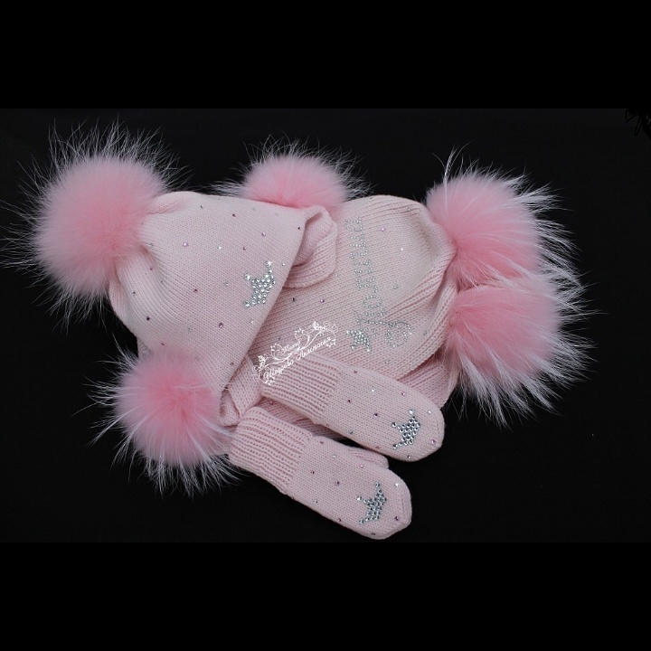 Комплект для маленькой принцессы - шапочка связана в два слоя, подойдет даже для суровой зимы. Ручная инкрустация хрустальными стразами. Меховые помпоны из финского енота, сьемные. Цена 3000 руб. Варежки в два слоя, без шва на ручке 1500 руб. Шарф 120-20 см с двумя помпонами 3000 руб, без 2000 руб, надпись имя и россыпь на обоих сторонах. Помпоны енот финский, сьемный.