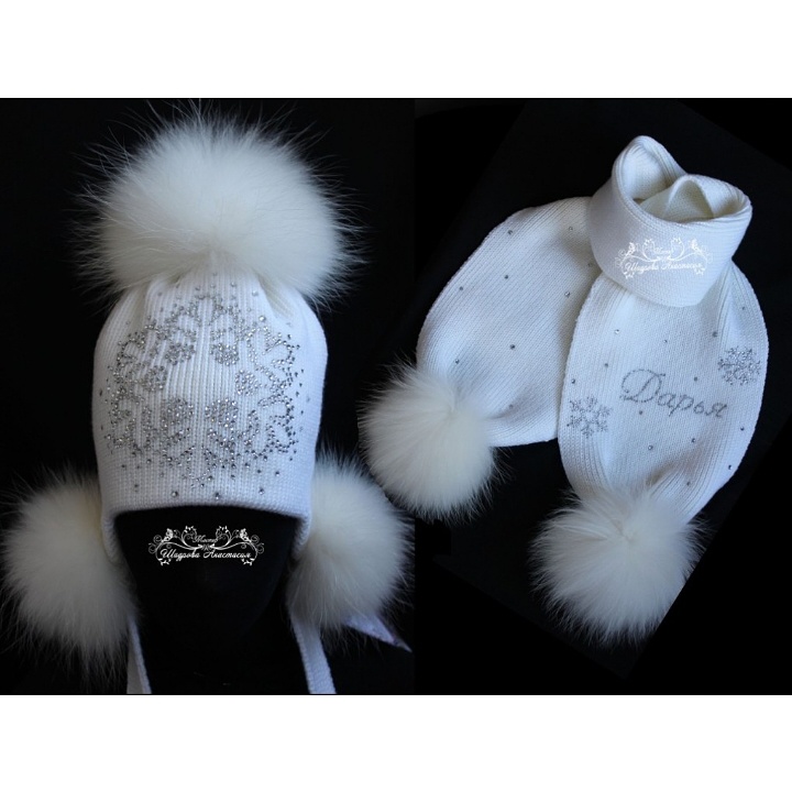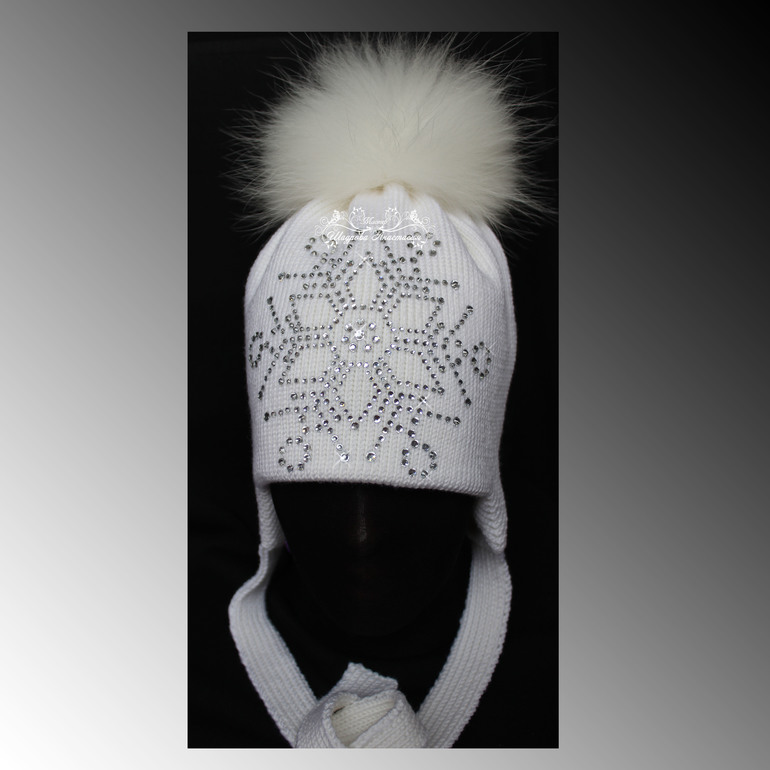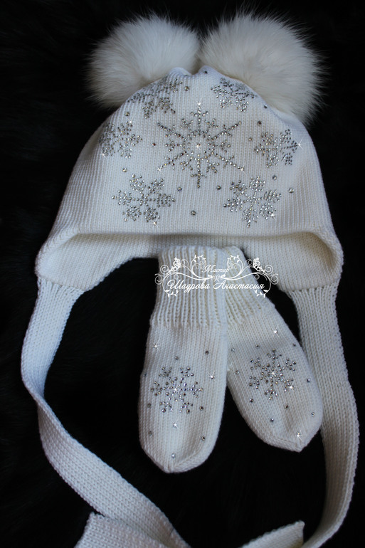 Шикарная инкрустация стразами снежинки выполнена в ручную. На шапочке около 850 хрустальных, искрящих страз. Два помпона из песца, сьемные. 3000 руб