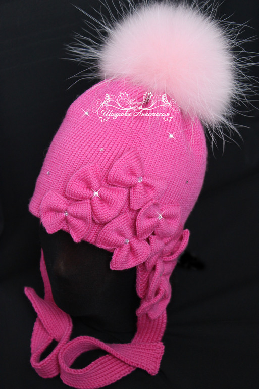 Шапочка в два слоя, ручная инкрустация стразами и очаровательные бантики, шикарный помпон из финского енота альбиноса нежно-розового цвета, сьемный. Цвет помпона и пряжи по договоренности. Цена 2700 руб.
