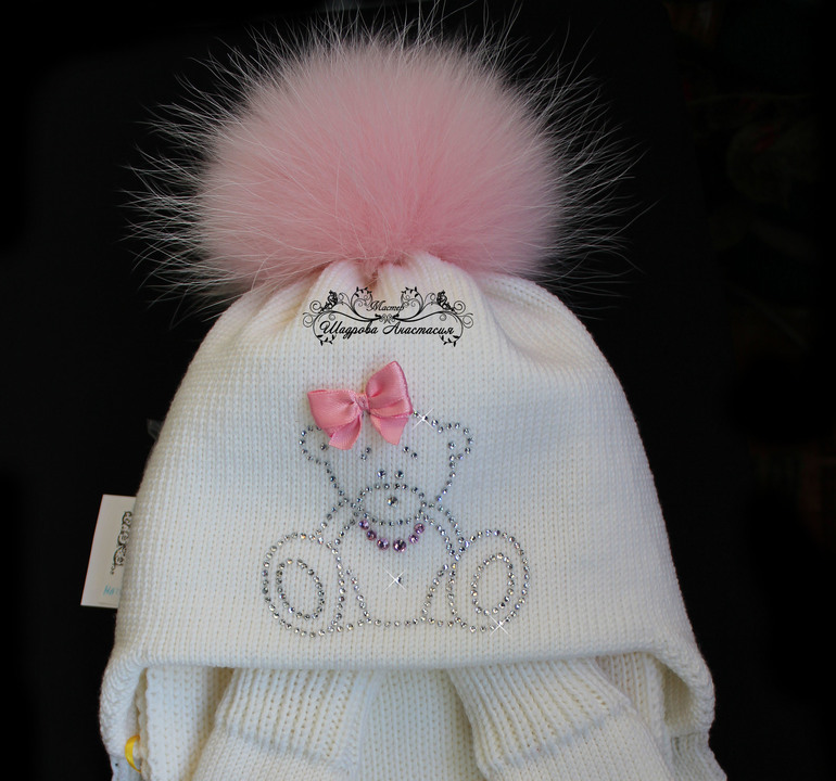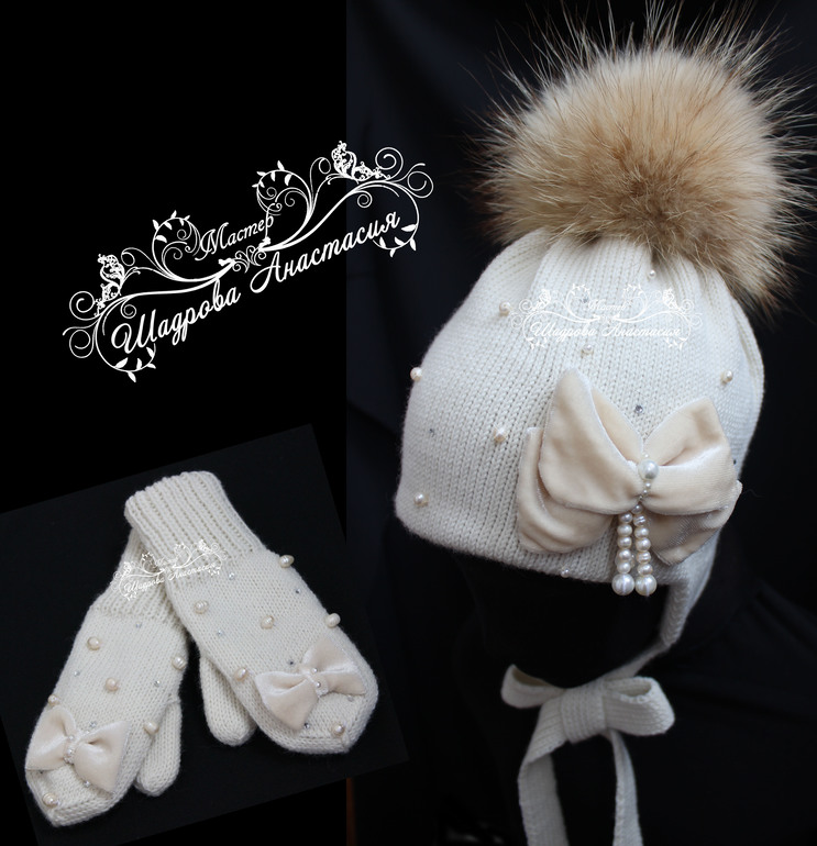 На шапочке велюровый бантик, расшита жемчугом и стразами. Помпон сьемный. Цвет по желанию. Цена-2500 руб.