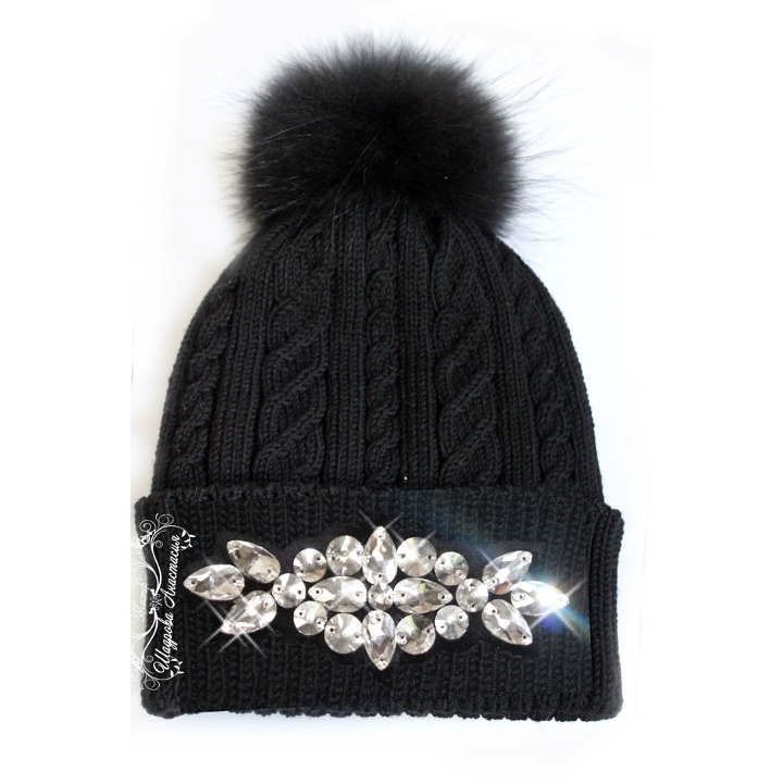 Шапочка связана узором косы, ручная инкрустация камнями. Помопон енот, сьемный