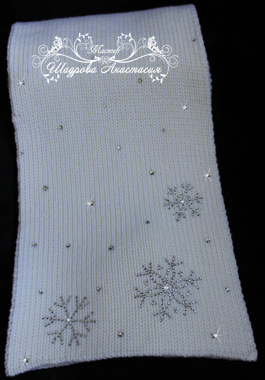 Можно связать шарф 20 см*120 см - аппликация в виде снега и трех снежинок около 350 страз. 2000 руб