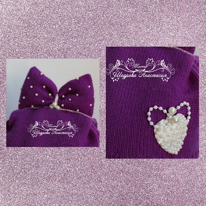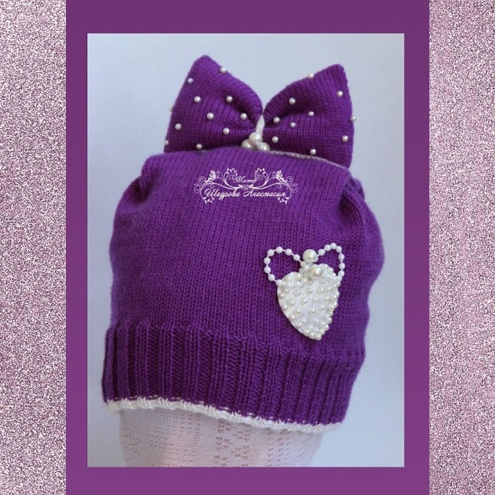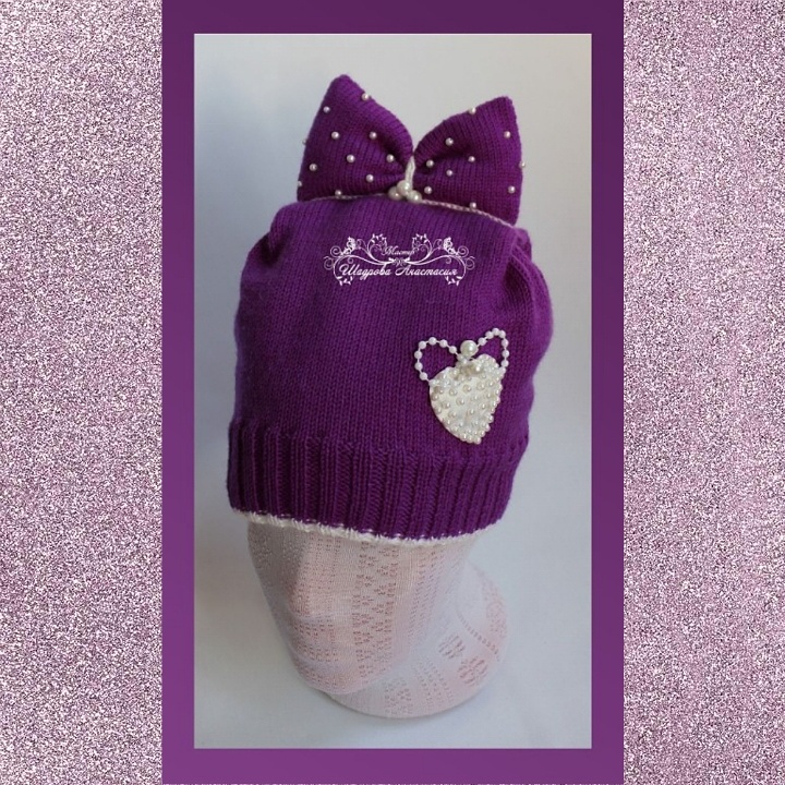 Шапочка в два слоя, связана из полушерсти, цвет фиалка, оригинальная макушка бант с бусинами, сердечко расшитое бусинами. Цена 1700 руб