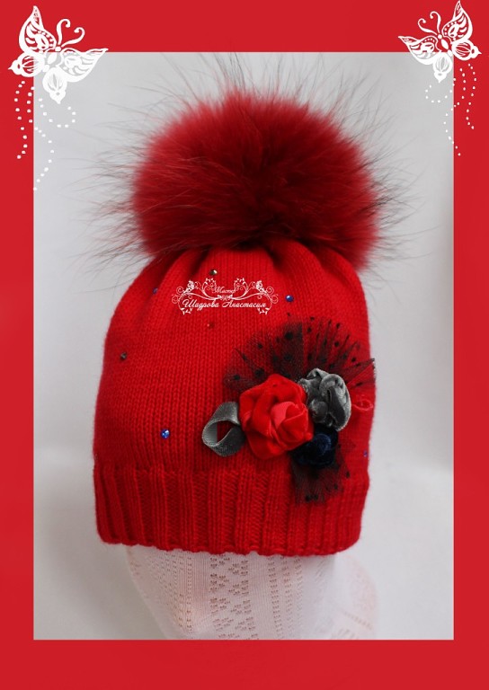 Шапочка из австралийского мериноса в два слоя. Розетка с розочками руч работы и стразы под цвет роз. Цена 1800 руб.