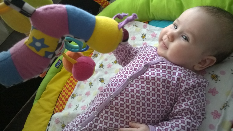 Уже хватает игрушки, хотя еще трудно их удержать в руках и все в рот - на пробу -)