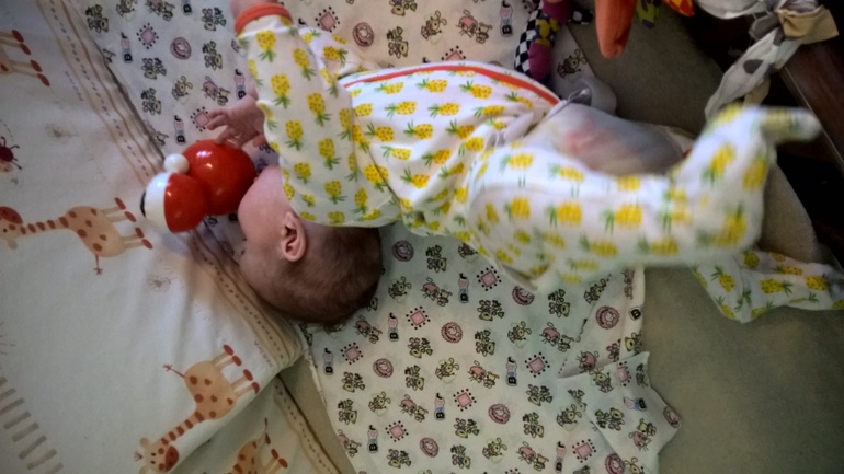 Из достижений Ксении Владимировны - перевороты на живот с любой стороны ( даже в шинках-) ) ,только вот теперь совсем не хочет лежать на спине. Не даёт маме скучать - переворачивается на живот, а так как руки еще не очень сильные, долго держаться так не может и начинает кричать и хныкать, потом я её переворачиваю на спину и все повторяется снова и снова -) вот так и развлекаемся