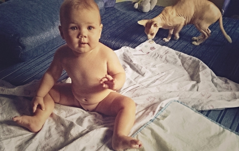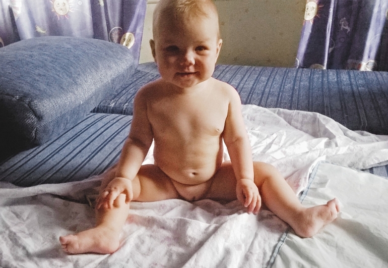 Алиса до года (развитие)Самостоятельно. Из положения на боку, оперлась на локоток, напрягла все свои кубики пресса и села.