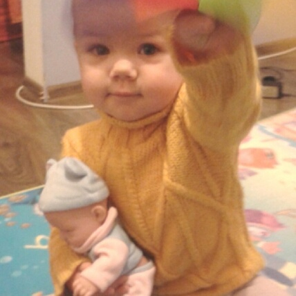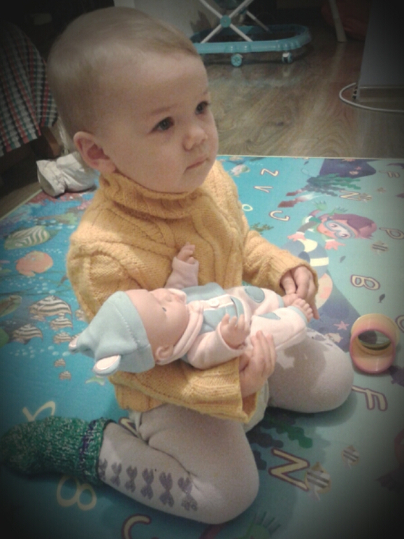 Подарили нам куколку. Я показала, как её кормить и качать. И... Алиса повторила это тут же. Боженьки, ей всего годик и чучуть, а она уже кормит свою Лялю и укачивает. Я в шоке.