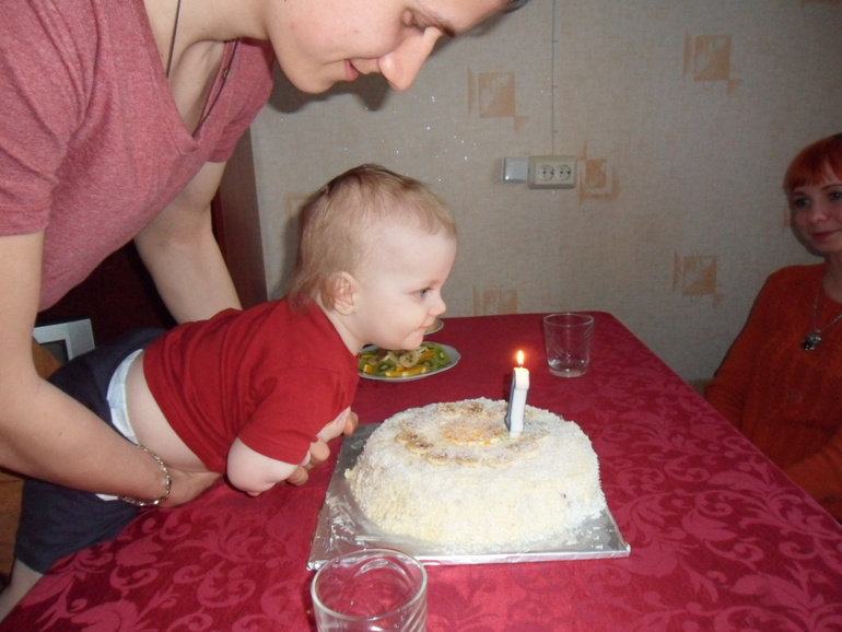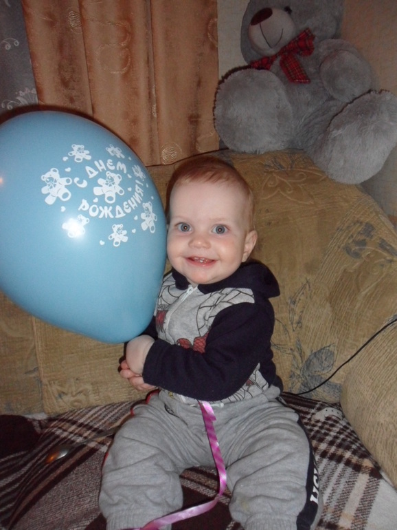 Так незаметно пролетело это время,вроде бы только недавно родился,был первый месяц,а вот раз и годик.Отмечали мы скромно,приглашать было некого,так в Питере особо друзей у нас не появилось,я пригласила двух девушек знакомых,с которыми лежала в больнице,у одной есть ребенок,которому 2,3,думала они будут играть,но не тут то было,Дима все тянулся к нему,хотел поиграть,а тот мальчик не особо хотел.Сережа купил 5 шариков для Димки,вот с ними он все время и играл.Подарили рубашечку,игрушку-шарик,который катается по полу,штанишки и музыкальный паровозик.Так же мы купили музыкальную черепаху(она оказалась Диме не интересна)и еще планируем купить домик развивающий,с кубиками и ключиками.Вот как то так..Сам Димка во всю ходит,ест уже все,имеется 5 зубиков.Сейчас ходим по врачам,проходим комиссию.
