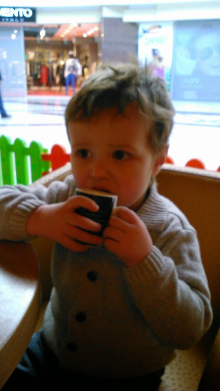 И вот теперь кофе. Главное, морщится, но пьет. Знаток. В фойе бассейна постоянно пытается у зазевавшихся мамочек стащить стаканчик с кофе. Еще и приговаривает "кусн" - вкусно.