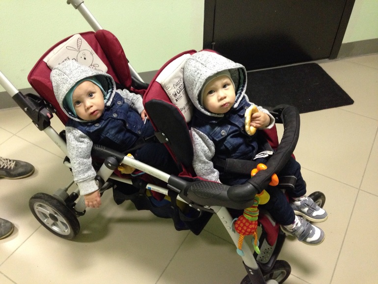 В общем, мальчишки мои, пряники, оба ходят, Макс бегает, залазит, слазит ну и падает потом, научился он ходить в 9 месяцев- поэтому здесь все шустро. Даня начал ходить с 11 месяцев, поэтому он еще не бегает, хотя шишек много)) у Макса 7 зубов, 9700 гр. веса, 73 см роста и ни одной прививки , кроме гепатита В. У Дани 6 зубов, 9740 гр веса, 74 см роста и все точно так же с прививками. По умелкам: говорим папа, баба, никакой мамы:(((, кака ( пока) пи или кики ( привет) плюс машут ручками, расчесываются, собирают пирамиду как попало, танцуют под барбариков, играют в ладушки и в 2 веселых гуся, говорят ае( але) ну и т. Д. Едят все, и взрослую еду( разрешенную детям ) ну и детскую. Кушаем грудь только перед сном в 21:00 и спать. Спим всю ночь. Подъем в 6:30 и опять грудь. Распорядок дня описывать не буду, так как они стали ходить в ЯСЛИ. Да, именно в ясли, частные, а я вышла на работу, на неполный рабочий день( формально) чтобы детские сохранить, ну вот так вот и живем. В 7:40 усаживаю деток в коляску спускаемся в лифте, доходим до машины: сначала одного пересаживаю, потом второго, потом колясон в багажник и до садика, там достаю коляску, пересаживаю по очереди их и в сад, оставляю их с коляской и на работу через дорогу... И так 5 дней в неделю, когда муж дома, то всем этим занимается он! Ну если кому нибудь что нибудь интересно, спрашивайте:)))