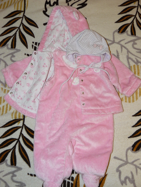 Комплект из материала вельбоа, подклад 100% хлопок. Включает в себя курточку и высокие ползунки. Утеплитель-синтепон 60 гр, застежка на кнопки. Капюшон с милыми ушками, на завязках. Очень мягонький и тепленький! Отлично подойдет на начало осени! Состояние НОВОГО!!! Был куплен за 1300руб, Велюровая шапочка фирмы EVA в подарок!