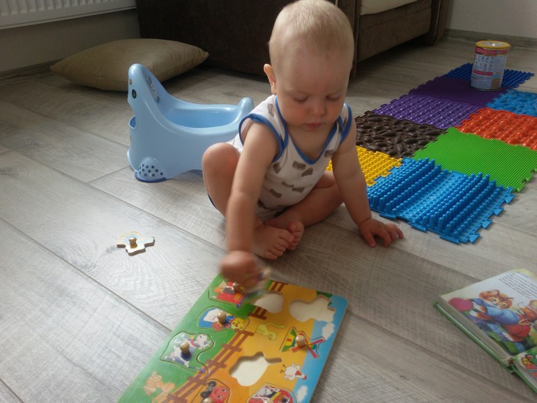 Еще достала их старых Диминых игрушек деревянные вкладыши. В 1 год 1 месяц Санька половину достает пальцами, остальные просто высыпает и совсем не пытается класть обратно.