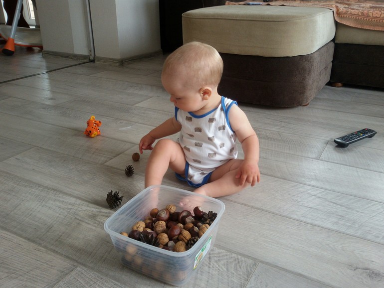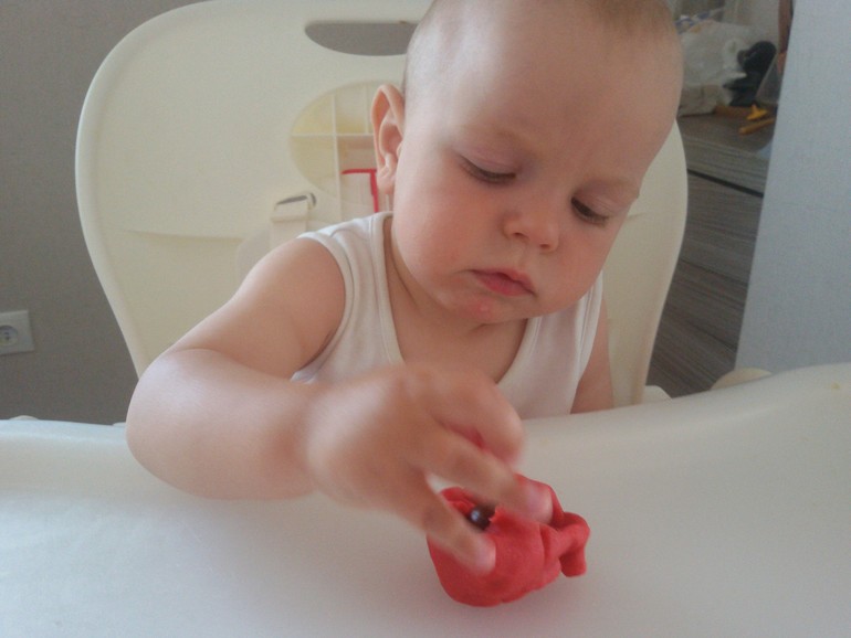 Сегодня снова играли с пластилином. Я прятала в пластилин каштан и сама же его оттуда и доставала. Не царское это дело - в пластилине ковыряться. Двумя пальчиками отщипывал маленькие кусочки и естественно пытался их попробовать. Но тем не менее радость, когда мама находила каштан, была огромной.