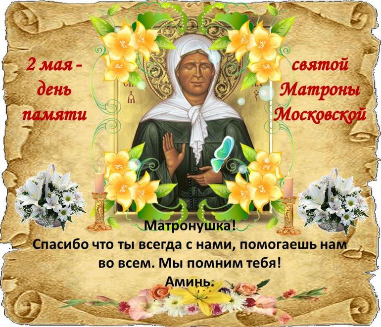 Святая Матушка Матронушка! Величаем тя, святая праведная блаженная Матроно, и чтим святую память твою, ты бо молиши о нас Христа Бога нашего! В день памяти твоей о самом важном прошу - дай всем девочкам счастья и исполнения заветной мечты о рождении здоровых малышей, будущим мамочкам - лекгих родов и здоровых малышей, а малышам крепкого здоровья на всю долгую жизнь! Моли Бога о нас, пожалуйста. О наших семьях, о наших детишках. Во имя Отца и Сына и Святого Духа. Аминь.