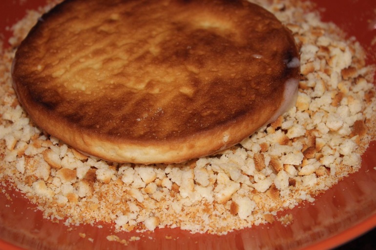Пару коржиков пускаем на присыпку, теперь каждый коржик окунаем в сметану и потом в присыпку.