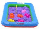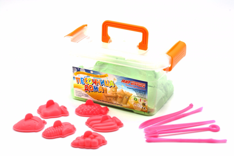 В набор входит: один цвет песка, 6 формочек, 1 тканевая песочница с жесткими бортиками, книжка.