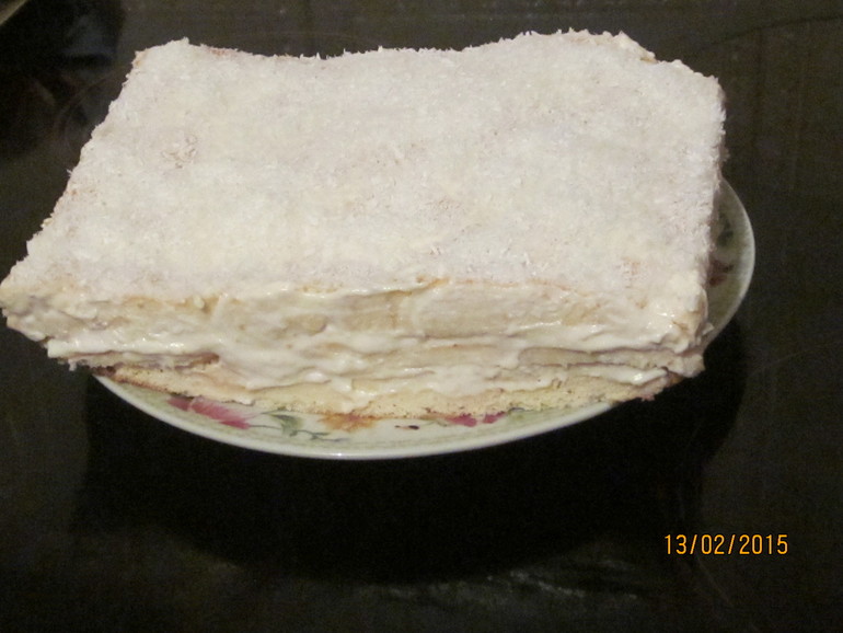 Смешиваем яйца (2 шт) и сахар (стакан) добавляем топленное слив. масл (150 гр), затем сметаны 4 столовых ложки, тщательно перемешиваем, я взбивала блендером, добавляем муку и разрыхлитель, тесто раскатываем на несколько коржей, печем в духовке при темп. 180 гр, минут 10, заранее готовим крем: взбиваем творожную массу (200 гр) сметану 5 ст. ложек, сахарную пудру, промазываем каждый корж и посыпаем каждый слой кокосовой стружкой=)) Вкусный и нежный тортик готов=))