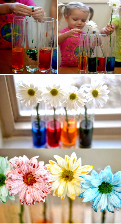 Пищевые красители, прозрачные стаканчики, ромашки ( или любые цветы белого цвета)