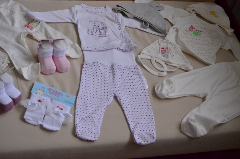 Вот такие вещички купили на первое время и на выписку из роддома (правда, на выписку еще шапочку не нашла подходящую и не успела довязать плед, но думаю скоро это исправить)