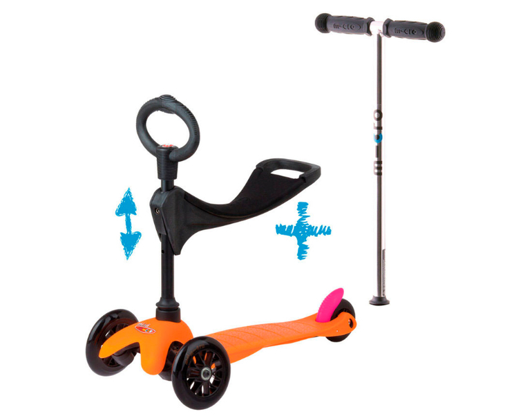 Самокат Micro Mini Micro Sporty 3 в 1 снабжен стульчиком, регулирующимся по высоте. Сиденье легко снимается, если малыш захочет кататься на самокате не сидя, а стоя. Рукоятки также демонтируются одним движением, заменить О-образную ручку с сиденьем на Т-образную не составит труда.