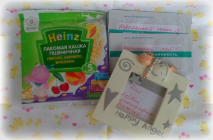 а ещё порция кашки, рамочка со славным ангелочком для первого фото крошки и по традиции беременные тесты