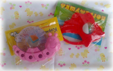грызунок в виде очаровательной улыбаки-улитки чисто-девчачьего цвета и рыбка погремушка с такой удобной прорезью-держателем для маленькой ручки