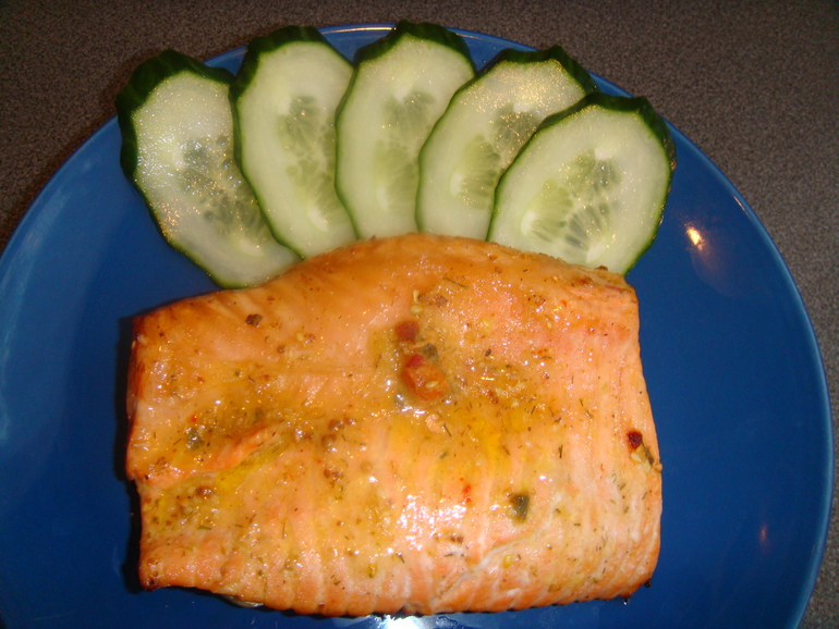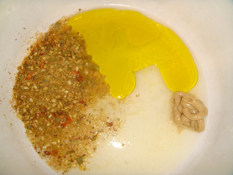1 ст.л. лимонного сока смешать с 2 ст.л. оливкового масла, 0,5 ч.л. горчицы и приправой для рыбы: