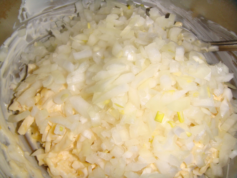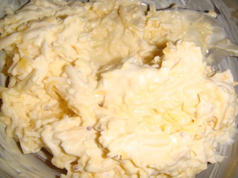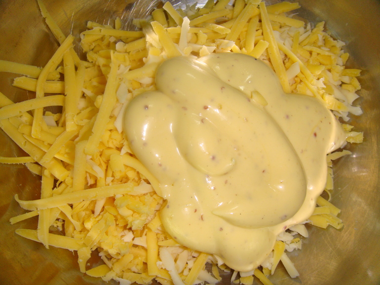 Натереть твердый сыр. Добавить майонез или любимый соус: