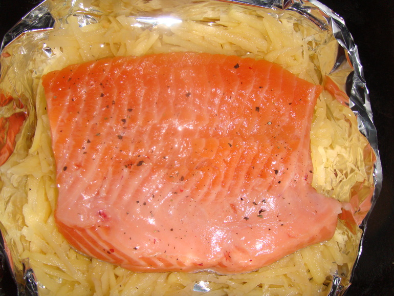 Запечь в духовке 5 минут. Достать и выложить куски рыбы на картошку: