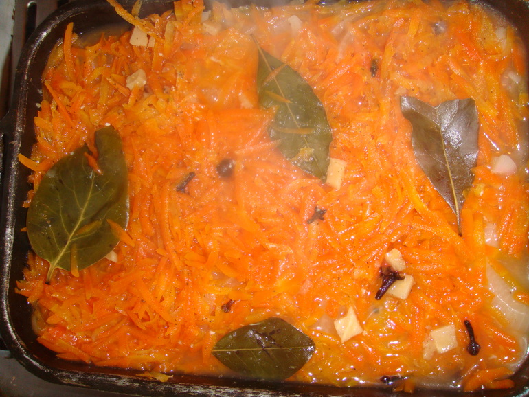 Для маринада закипятить 0,5 литра воды со щепоткой соли, 1 ст.л. сахара, 3 лавровыми листиками, корнем петрушки, душистым перцем и гвоздикой. Проварить 5 минут, затем добавить 1 ч.л. укусусной кислоты (70%). Залить горячий маринад на рыбу с овощами: