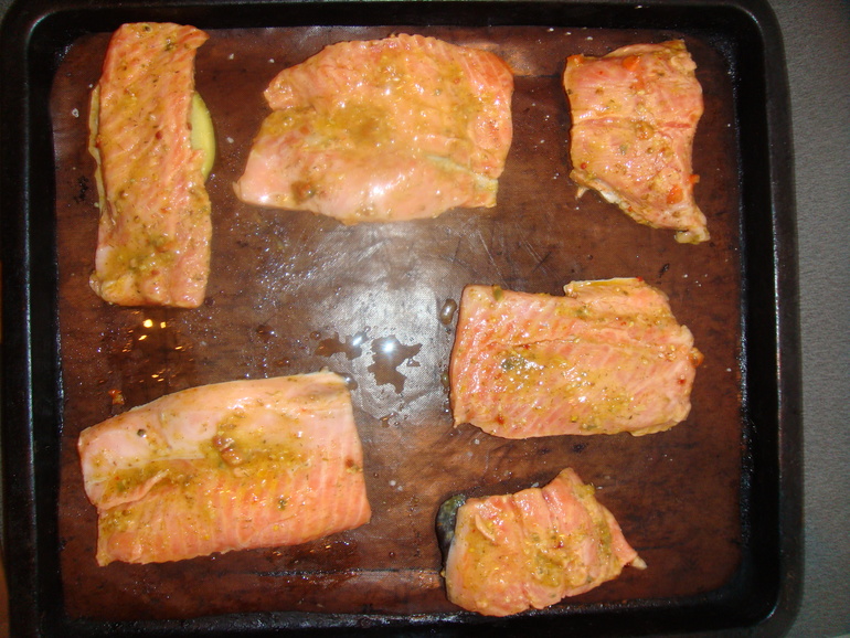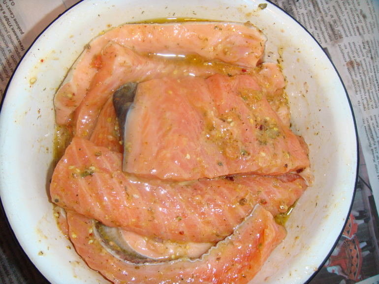 Обмазать все кусочки рыбы минимум на 15 минут: