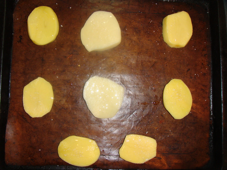 На противне в это время разложить сантиметровые пласты крупных картошин, посоленных и сдобренных каплей оливкового масла: