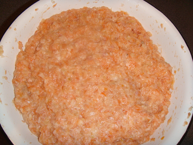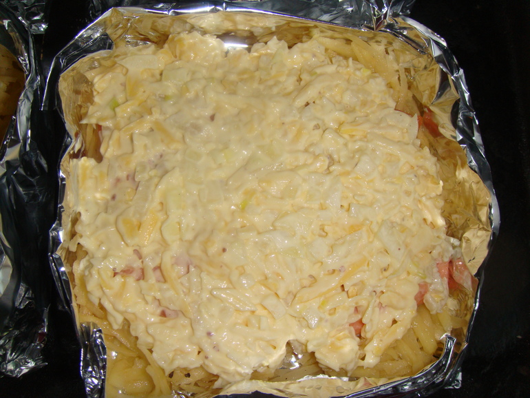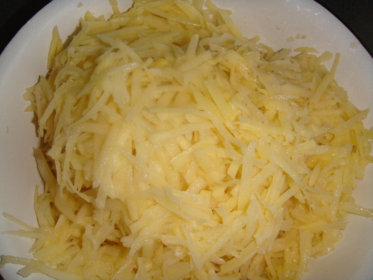 Перемешать. Это "одеяло". Теперь натереть на "перину" сырой картофель: