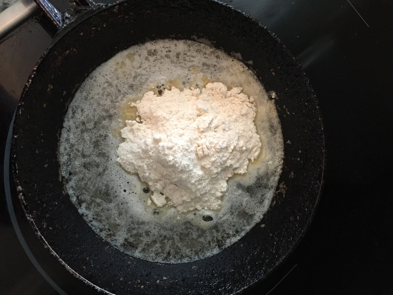 Спассировать столовую ложку сливочного масла и столовую ложку муки, минут 10, постоянно помешивая