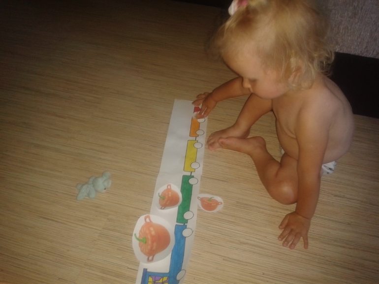 Потом поиграли в кастрюльки-тыковки, которые ехали на кухню на поезде. Нужно было расставить по уменьшению и назвать на какой овощ похожи.