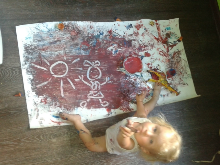 Помазюкали по листу и тут открылось интересное свойство наших красок и листа виниловых обоев. Когда я готовила краски, то не оказалось у нас дома растительного масла. А рисование на другой день переносить совсем не хотелось. Добавила я вместо него .... маргарин растопленный.