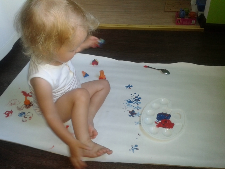 Потом я ей дала лапшичную кисточку и самодельные краски. Доченьке ОЧЕНЬ-ОЧЕНЬ понравился этот вариант творчества. Правдо она говорила, что моет пол