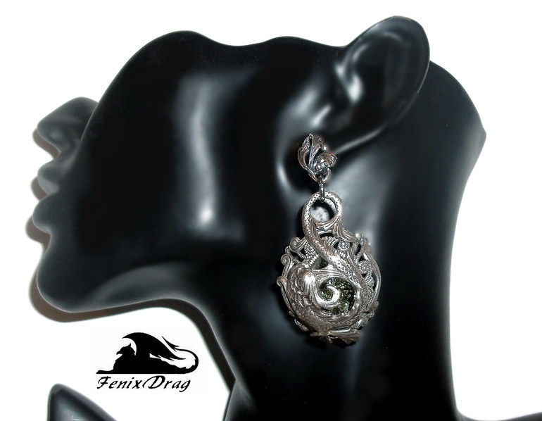 Винтажные длинные серьги "Живая вода" с рыбками и зеленым янтарем в Старинном, Стимпанк стилях