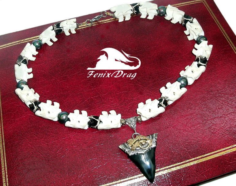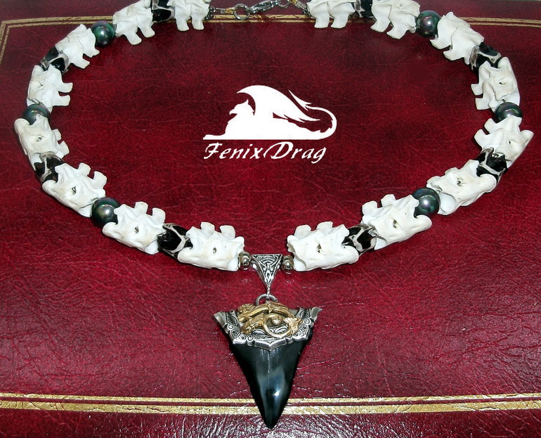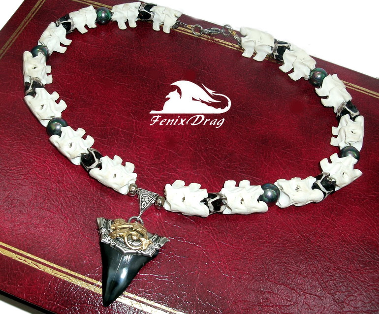 Стильный чокер создан из настоящих позвоночников двух змей (королевская кобра), белого с костяными выступами и окрашенного в черно-белой гамме (покрытие качественное) с окаменелым зубом реликтовой акулы Кархародон, которая обитала на нашей планете около 25 млн. - 1,5 млн. лет назад (найден в Южной Каролине), и черным радужным жемчугом.